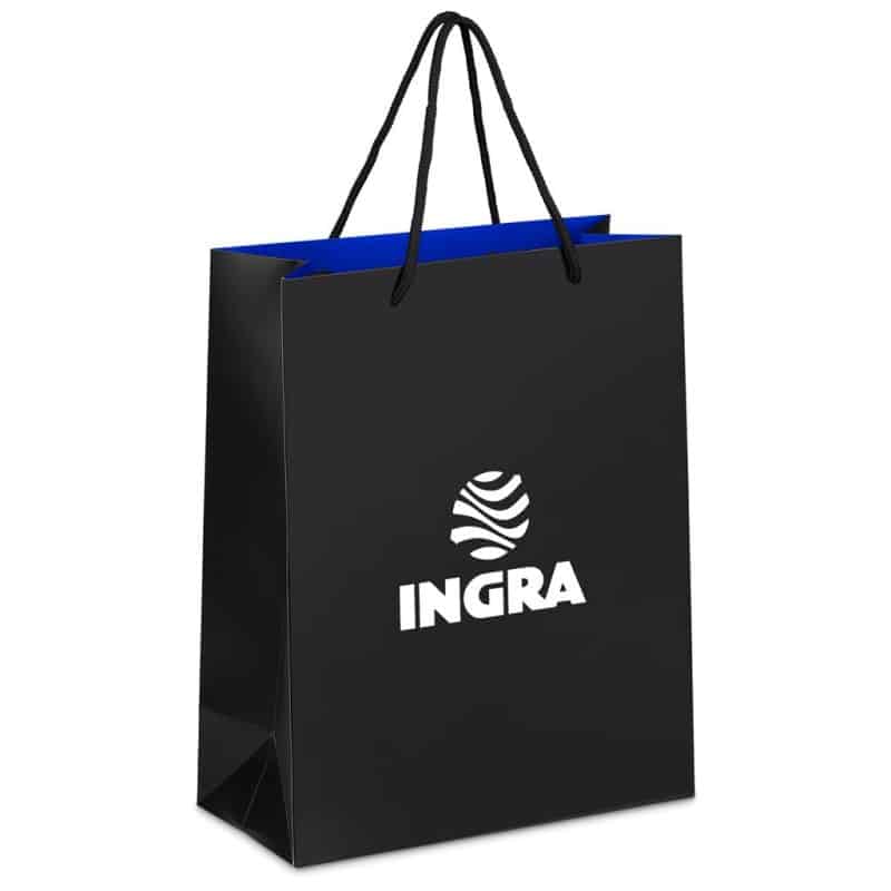 The bold, vibrant inner colour adds a striking touch of celebratory colour, beautifully contrasted by the matte black exterior. Designed with sturdy black cord handles and a reinforced baseboard, the bag offers both style and durability.