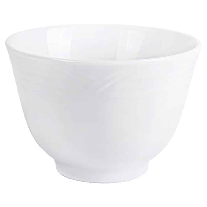 Contemporary design in white with a subtle circular embossed rim on a white fine porcelain body