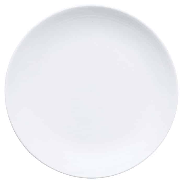 Contemporary design in white with a subtle circular embossed rim on a white fine porcelain body