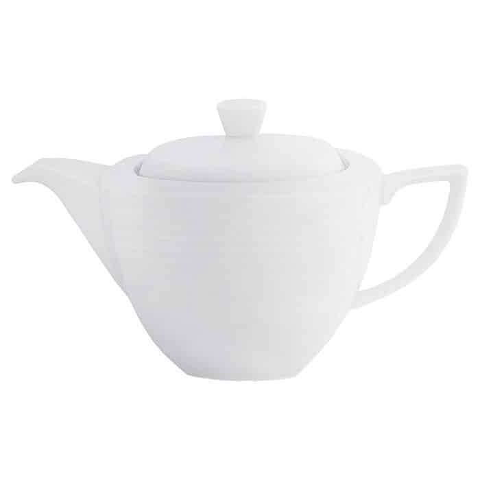 Contemporary design in white with a subtle circular embossed rim on a white fine porcelain body
