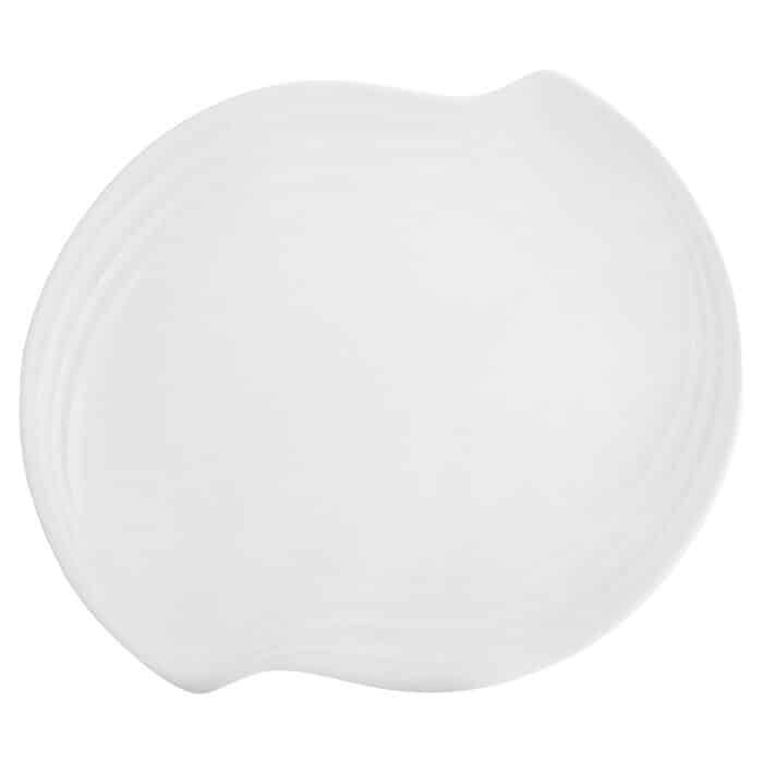 Contemporary design in white with a subtle circular embossed rim on a white fine porcelain body