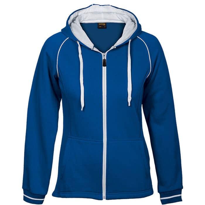 Three-piece lined hood with contrast piping and drawcord