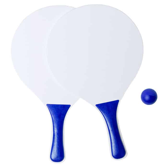 Pair of beach rackets in white and natural wood.