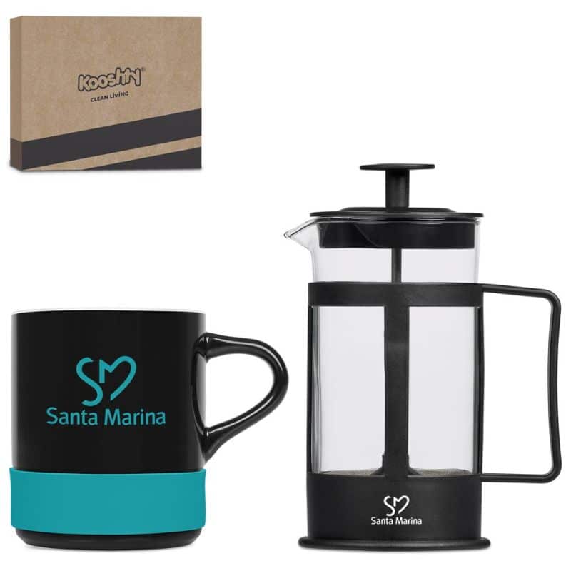 Made from high-quality A-Grade ceramic, the black mug in this set has a silicone band, which accentuates branding that matches the band colour. It’s combined with a black coffee plunger, ideal for making a single cup of coffee.