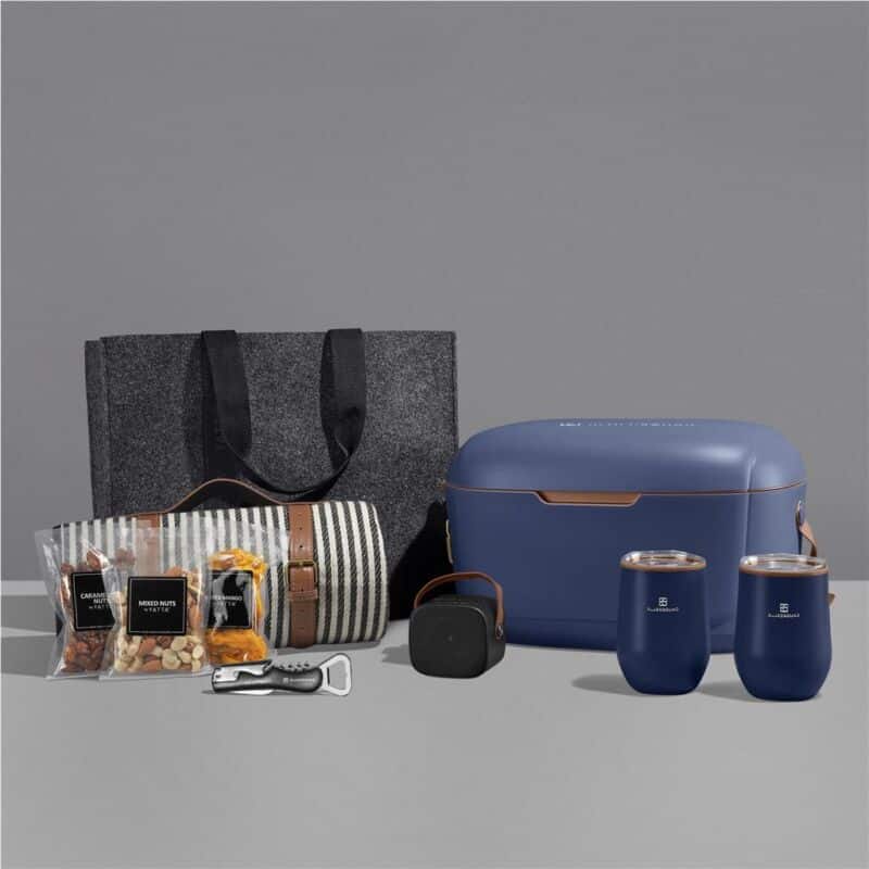 The Yatta range of hampers is expertly crafted to provide a delightful experience with a curated selection of premium items, elegantly presented in a luxury 12-Litre Cooler Box. This hamper is further encased in a large size, durable Dark Grey RPET felt gift bag.